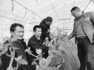 ????2月29日,榮獲“河南省十佳村官”的商水縣鄧城鎮(zhèn)“大學(xué)生村官”、駐許村第一書(shū)記張耀(左二)在自己創(chuàng)辦的百畝葡萄園里向葡萄種植戶(hù)傳授溫室葡萄管理技術(shù)。近兩年來(lái),張耀在該鎮(zhèn)黨委、鎮(zhèn)政府的幫助下先后投資300多萬(wàn)元?jiǎng)?chuàng)辦了百畝葡萄園,并幫助許村群眾發(fā)展葡萄、晚秋黃梨、蜜桃300多畝。 本報(bào)記者巴富強(qiáng)通訊員喬連軍攝