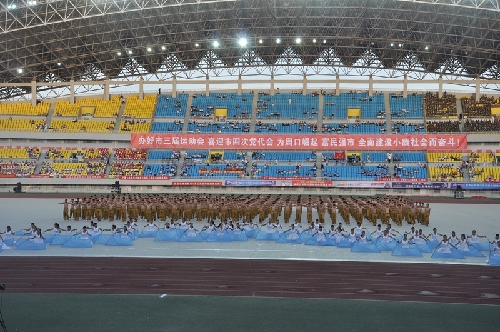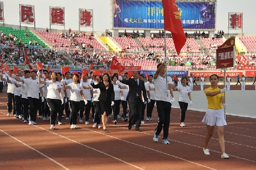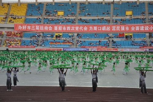 ????大型體育展示表演開始了,《印象周口》氣勢(shì)磅礴,來自周口幼兒師范學(xué)校和周口科技職業(yè)學(xué)院、沈丘縣教體局等單位的演員們披著鮮明的旗幟,激情奔跑在寬闊的體育場(chǎng)上,迎風(fēng)飄揚(yáng)的旗幟讓整個(gè)會(huì)場(chǎng)變成了藍(lán)色海洋;周口職業(yè)技術(shù)學(xué)院衛(wèi)生學(xué)院與周口文昌中學(xué)的朗誦表演《荷韻悠長(zhǎng)》吟誦豪邁,響徹會(huì)場(chǎng);周口市自行車協(xié)會(huì)聯(lián)合川匯區(qū)、淮陽縣、太康縣等多個(gè)教體育一起表演的《崛起之路》更是體現(xiàn)了周口正在實(shí)現(xiàn)中國(guó)夢(mèng)的征途上迅速崛起,書寫著新的精彩篇章……