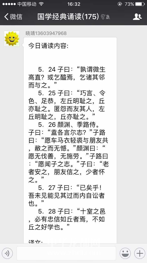 ????建立該微信群的是團市委工作人員劉曉靖。劉曉靖告訴周口晚報記者,建立該微信群的目的是想讓大家多讀讀國學經典,增加大家的文學涵養(yǎng),讓大家養(yǎng)成讀書的習慣?!皠傞_始只有十幾個人,大家有些不好意思,有的人覺得自己讀得不好張不開口,我就做一些示范,引領大家誦讀。不久,加入微信群的人多了,通過幾個人帶動,大家誦讀的就多了?!眲跃刚f,讀的方式就是大家通過微信的語音功能,讀一些《論語》中的經典句子。過了一段時間,大家對這種方式越來越認可,加入該微信群的人也越來越多,人數(shù)從剛開始的十幾個人增加到近200人。現(xiàn)在,該微信群里不但有電臺、電視臺的專業(yè)主持人,而且有一些學者。以前拿不準的字,現(xiàn)在都會有人講解,大家也有了學習對象。這個微信群從成立到現(xiàn)在,《弟子規(guī)》、《大學》、《中庸》、《論語》已讀一遍,四書里面只剩下《孟子》還沒有讀。