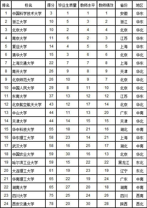 | 對(duì)比往年,《2017中國(guó)大學(xué)評(píng)價(jià)》指標(biāo)體系對(duì)研究生培養(yǎng)指標(biāo)做了完善性修改:研究生科研成果全部計(jì)入研究生培養(yǎng)得分,不再計(jì)入學(xué)校的科學(xué)研究得分。 增加全國(guó)大學(xué)生英語(yǔ)競(jìng)賽獲獎(jiǎng)指標(biāo):研究生獲獎(jiǎng)結(jié)果,進(jìn)入研究生培養(yǎng)體系,本科生獲獎(jiǎng)結(jié)果,進(jìn)入本科生培養(yǎng)體系。全國(guó)大學(xué)生英語(yǔ)競(jìng)賽是唯一所有學(xué)科都能參加的競(jìng)賽,賦予較高的權(quán)重。 《2017中國(guó)大學(xué)評(píng)價(jià)》的指導(dǎo)思想、數(shù)學(xué)模型、指標(biāo)賦值,見(jiàn)武書連即將發(fā)表的《2017中國(guó)大學(xué)評(píng)價(jià)》論文。 自2015年起,《中國(guó)大學(xué)評(píng)價(jià)》課題組不再使用SCI、SSCI、A&HCI作為國(guó)際期刊論文的數(shù)據(jù)來(lái)源。2013、2014年,《中國(guó)大學(xué)評(píng)價(jià)》課題組對(duì)全世界約40000種期刊重新篩選,有9940種期刊成為《中國(guó)大學(xué)評(píng)價(jià)》源期刊。原SCI、SSCI、A&HCI的13000多種期刊中,有6000種左右沒(méi)有入選,約3000種非SCI、SSCI、A&HCI源期刊進(jìn)入《中國(guó)大學(xué)評(píng)價(jià)》源期刊?!吨袊?guó)大學(xué)評(píng)價(jià)》課題組將在近期修訂原有的9940種國(guó)際論文源期刊。 2017年中國(guó)一流大學(xué)的標(biāo)準(zhǔn)與上年相同:在中國(guó)大學(xué)評(píng)價(jià)中,同時(shí)滿足以下三個(gè)條件的大學(xué):1.教師學(xué)術(shù)水平居全國(guó)大學(xué)前30名。2.教師教學(xué)科研效率居全國(guó)大學(xué)前30名。3.本科畢業(yè)生質(zhì)量居全國(guó)大學(xué)前30名。 將滿足上述3項(xiàng)條件的大學(xué)的3項(xiàng)排名名次相加后升序排列,得分越低越好。得分相同,教師平均學(xué)術(shù)水平高的大學(xué)居前。 據(jù)此標(biāo)準(zhǔn),2017年中國(guó)一流大學(xué)的數(shù)量為24所,比上年增加一所。其中985工程大學(xué)23所,211工程大學(xué)1所。華東理工大學(xué)是中國(guó)一流大學(xué)中,唯一的211工程大學(xué)。