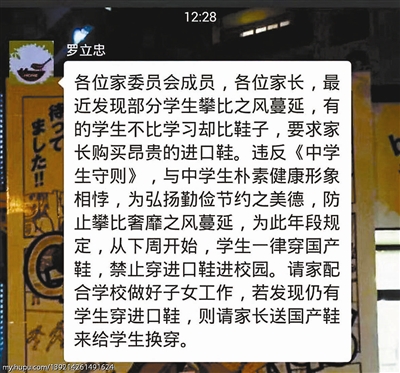 近日,有網(wǎng)友在論壇發(fā)帖稱,福建晉江市子江中學(xué)規(guī)定稱,禁止學(xué)生穿進(jìn)口鞋進(jìn)校。昨天,該校政教處一名老師回應(yīng)稱,網(wǎng)傳通知是該校個(gè)別班級的班主任上周發(fā)在班級微信群里的,不是學(xué)校的行為。學(xué)校只是提倡學(xué)生穿便宜一點(diǎn),不要攀比,并未強(qiáng)制規(guī)定不能穿進(jìn)口鞋。 根據(jù)網(wǎng)友貼出的微信截圖,一則面向家委會成員的通知顯示,因最近發(fā)現(xiàn)部分學(xué)生攀比之風(fēng)蔓延,有的學(xué)生不比學(xué)習(xí)卻比鞋子,要求家長購買昂貴的進(jìn)口鞋,為此年段規(guī)定,從下周開始,學(xué)生一律穿國產(chǎn)鞋,禁止穿進(jìn)口鞋進(jìn)校園。通知中還稱,若發(fā)現(xiàn)仍有學(xué)生穿進(jìn)口鞋,則請家長送國產(chǎn)鞋來給學(xué)生換穿。 該通知遭曝光后,有不少網(wǎng)友評論稱,“不少耐克阿迪也是國產(chǎn)的啊,明明白白的made in China,難道也不讓穿嗎?” 也有網(wǎng)友指出,國產(chǎn)鞋未必比進(jìn)口鞋便宜。據(jù)網(wǎng)友曬出的一款“李寧韋德之道四全明星限量版”淘寶銷售頁面截圖,這款鞋售價(jià)為人民幣13999元。 有網(wǎng)友認(rèn)為,現(xiàn)在中學(xué)生攀比風(fēng)氣過重,學(xué)校這一做法合理。也有人認(rèn)為,“嚴(yán)禁攀比”的初衷是好的,但“禁止穿進(jìn)口鞋”的方法不妥。有網(wǎng)友質(zhì)疑,學(xué)校對教師和學(xué)生的標(biāo)準(zhǔn)不統(tǒng)一,“教師隊(duì)伍里身穿國外品牌的本身就不是少數(shù),學(xué)校自身用的東西里不少都有國外的技術(shù)”。也有網(wǎng)友表示,孩子成績好,家長自掏腰包獎(jiǎng)勵(lì)一雙鞋無可厚非,學(xué)校無權(quán)干涉。 昨天,北青報(bào)記者就此事聯(lián)系晉江市子江中學(xué),一名政教處的老師表示,網(wǎng)傳通知是該校高中部某一年級個(gè)別班級的班主任發(fā)的,“這名老師上周發(fā)在班級微信群里的,不是學(xué)校的行為”。 “我們沒有強(qiáng)調(diào)一定是國產(chǎn)不能是進(jìn)口,我們只是反對鋪張浪費(fèi),提倡勤儉節(jié)約,是讓大家低調(diào)一點(diǎn),穿便宜一點(diǎn),不要攀比”。這名老師稱,學(xué)校里很多孩子家庭條件不錯(cuò),平時(shí)確實(shí)存在攀比之風(fēng)。平時(shí)學(xué)校要求學(xué)生統(tǒng)一穿著校服,但“有家長反應(yīng),學(xué)生間攀比鞋子現(xiàn)象嚴(yán)重?!?/p> 這名老師表示,目前,學(xué)校沒有相關(guān)規(guī)定強(qiáng)制禁止學(xué)生穿進(jìn)口鞋,“該穿什么就穿什么,低調(diào)一點(diǎn)就行啦”。 據(jù)子江中學(xué)學(xué)校官網(wǎng)介紹,該校創(chuàng)辦于2001年秋,是晉江市首所社會力量創(chuàng)辦的全日制完全中學(xué)。2010年5月,該校曾榮獲“全國民辦先進(jìn)學(xué)?!钡确Q號。 |