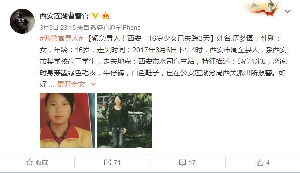 ????17歲周至女孩乘汽車到西安上學失聯(lián),家人心急如焚。 ????西部網(wǎng)訊(陜西廣播電視臺《都市快報》記者 趙楊梅子)西安周至一個17歲的女孩,因為上學坐上了來西安的汽車,但是誰也沒想到,坐上車后的她卻就此和家里失了聯(lián),家人多方尋找未果,心急如焚。 ????周夢圓的姑姑:“我要找我侄女,直到現(xiàn)在已經(jīng)五天了,跟家里也不聯(lián)系,家里人非常著急,希望能找到她?!?/p> ????據(jù)記者了解,3月6號下午兩點,17歲的周夢圓被媽媽目送著從周至老家坐上了來西安的長途汽車。 ????因為當天出門周夢圓忘了帶手機,下午四點多一到站,就問長途汽車司機王師傅借了手機,給媽媽報平安。 ????周夢圓媽媽說,當時女兒就是給她打電話說馬上去西安龍馬補習學校上學,可直到晚上六點多,老師打電話給周媽媽說,周夢圓還沒有到校。 ????周夢圓的姑姑:“當天我跟她媽媽就在西安找,網(wǎng)吧、親戚、朋友都找不到她,娃學習也挺好,馬上高考,上次考了個前三她媽還說一只腳已經(jīng)跨進大學門了?!?/p> ????今年就要參加高考了,可這時候周夢圓卻不知道去哪了。 ????周夢圓的姑姑:“你快點聯(lián)系我們,有啥事你就說,你媽也是通情達理的人,你到外面萬一有啥事,大家誰也接受不了?!?/p> ????17歲的周夢圓,身高1米6,離家時身穿墨綠色毛衣、牛仔褲、白色鞋子,已經(jīng)跟家人失聯(lián)五天了,如果大家見過這個孩子,請趕緊和她的家人聯(lián)系。 ????聯(lián)系電話:135-7149-6496 |