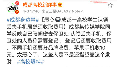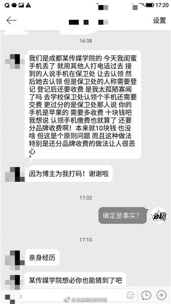 ????認(rèn)領(lǐng)丟失物品需要交費(fèi),四川傳媒學(xué)院近日設(shè)立的“失物招領(lǐng)費(fèi)”在學(xué)子中引發(fā)爭議。日前,該校黨委宣傳部副部長孫浩睿告訴北京青年報(bào)記者,學(xué)校并非強(qiáng)制收費(fèi),收取的費(fèi)用將作為對撿拾者的獎(jiǎng)金。對此,法律人士表示,制定失物招領(lǐng)收費(fèi)的規(guī)則不違法,但如果校方強(qiáng)制收取,則涉嫌侵犯學(xué)生財(cái)產(chǎn)權(quán),是違法行為。 ????網(wǎng)曝 ????到保衛(wèi)處認(rèn)領(lǐng)丟失手機(jī)需繳費(fèi)10元 ????近日,四川傳媒學(xué)院有學(xué)生在網(wǎng)上爆料稱,自己陪同學(xué)去學(xué)校保衛(wèi)處認(rèn)領(lǐng)丟失的手機(jī)時(shí),保衛(wèi)處的人員稱需要登記并收取費(fèi)用,且不同手機(jī)要分品牌收費(fèi),蘋果手機(jī)要收費(fèi)10元。 ????四川傳媒學(xué)院一位學(xué)生告訴北青報(bào)記者,他沒有丟過東西,但身邊一位同學(xué)確實(shí)曾因丟了一部蘋果手機(jī),向?qū)W校保衛(wèi)處交了10元的“失物招領(lǐng)費(fèi)”。關(guān)于是否知道學(xué)校設(shè)立了“失物招領(lǐng)費(fèi)”,這名學(xué)生稱“開學(xué)第一節(jié)課院長就在會(huì)議上說過”。 ????4月7日,四川傳媒學(xué)院黨委宣傳部副部長孫浩睿告訴北青報(bào)記者,學(xué)校設(shè)立“失物招領(lǐng)費(fèi)”, “一方面是對拾金不昧行為的肯定,另一方面是想利用這種方式給同學(xué)提個(gè)醒,一定注意保管好自己的東西”。 ????孫浩睿向北青報(bào)記者解釋,“失物招領(lǐng)費(fèi)”并不是強(qiáng)制對學(xué)生收取的,“如果學(xué)生不愿意承擔(dān)這部分費(fèi)用,則由學(xué)校來承擔(dān)”。 ????對于學(xué)校設(shè)立“失物招領(lǐng)費(fèi)”。有網(wǎng)友表示理解,認(rèn)為學(xué)校的出發(fā)點(diǎn)是好的,也有人認(rèn)為 “物歸原主是規(guī)則”,不應(yīng)該收取費(fèi)用。此外,也有網(wǎng)友表示,“收錢不重要,重要的是收的錢怎么用,怎么做到透明化?”