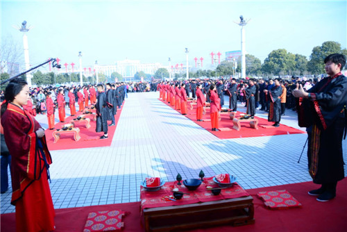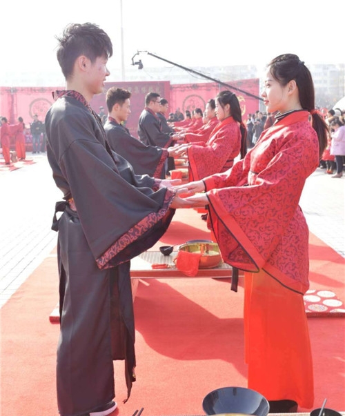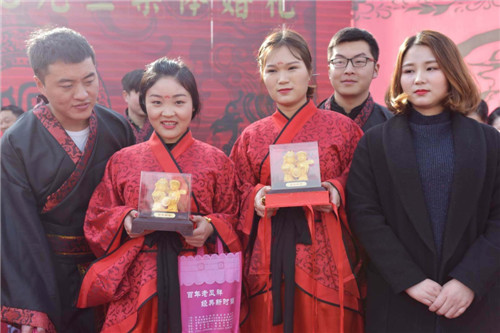 記者在現(xiàn)場看到,16對新人在司儀的引導下,采用中國古典婚禮儀式,有牽紅線、結發(fā)、拜天地等程序,儀式簡單而隆重,新人家屬、1000多名市民圍觀見證了新人喜結連理。