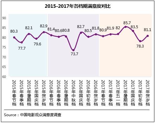從年內(nèi)調(diào)查的7個檔期來看,除初冬檔以外的其他6個檔期滿意度均進入“滿意”區(qū)間(≥80分),其中暑期檔滿意度得分85.7分,居年內(nèi)首位,同時也是自滿意度調(diào)查開展以來的檔期最高分。另外,2017年檔期滿意度的高點和低點較2015年、2016年均有提升。