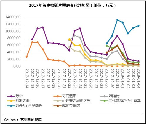 于12月29日上映的國產(chǎn)喜劇IP“前任系列”的第三部作品《前任3:再見前任》整體表現(xiàn)也較優(yōu)異,影片用接地氣的風格闡釋愛情與成長的主題,讓人捧腹又直戳人心,滿意度80.7分居檔期第二位;在良好口碑支撐下,影片票房也表現(xiàn)出了逆市上揚的巨大潛力。