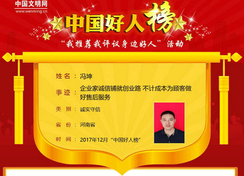 中華龍都網(wǎng)訊(周口報(bào)業(yè)全媒體記者 馬治衛(wèi))1月10日下午2:00,由中央文明辦主辦的2017年12月中國(guó)好人榜發(fā)布儀式暨全國(guó)道德模范與身邊好人現(xiàn)場(chǎng)交流活動(dòng)在惠州廣播電視傳媒集團(tuán)舉行。太康縣馮坤成功入選2017年12月份“中國(guó)好人榜”。截至目前,太康縣“中國(guó)好人”數(shù)量已達(dá)27位,據(jù)全國(guó)縣級(jí)前列。