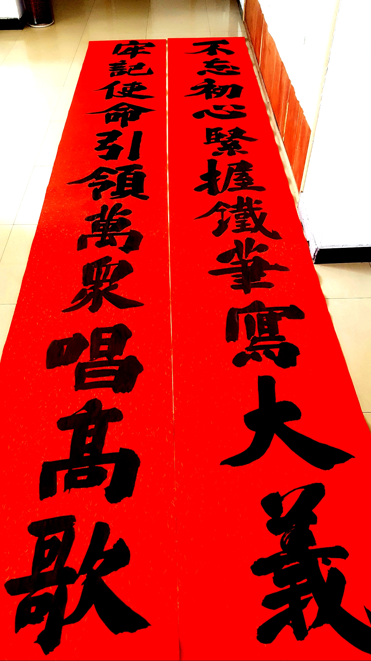 邢懷章以歐陽(yáng)通筆法融合魏碑,大楷榜書(shū)創(chuàng)作而成,春聯(lián)長(zhǎng)達(dá)5米,每字徑80公分左右,一氣呵成,不計(jì)工拙,近兩個(gè)小時(shí)完成兩幅巨型春聯(lián),表達(dá)了對(duì)周口報(bào)業(yè)集團(tuán)的祝福,映出了喜慶的年味。