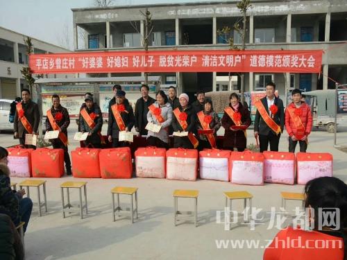 中華龍都網(wǎng)訊(周口報業(yè)全媒體記者 付永奇 趙永昌 文/圖))2月10日下午,商水縣平店鄉(xiāng)曾莊小學(xué)操場內(nèi),人頭攢動、熱鬧非凡,村里評選出來的10位好婆婆、好媳婦、好兒子、清潔文明戶、脫貧光榮戶等“五好”群眾代表身披綬帶、胸戴紅花,臉上都洋溢著幸福的喜悅;一些民間文藝團(tuán)體分別助興表演了挑花籃、扇子舞、廣場舞等喜慶的節(jié)目,把現(xiàn)場氣氛烘托得異常隆重?zé)崃摇!盀楹霌P(yáng)社會公德、家庭美德,提升群眾素質(zhì)和文明程度,春節(jié)來臨之際我們召開‘五好’表彰大會,下面有請鄉(xiāng)黨委副書記、鄉(xiāng)長徐汝濤給大家講話......”隨著主持人、鄉(xiāng)紀(jì)委書記劉新光的開場白,臺下響起了一陣熱烈的掌聲?!伴_展好婆婆、好媳婦、好兒子、清潔文明戶、脫貧光榮戶等模范家庭人物評選是我鄉(xiāng)精神文明建設(shè)工作的一項重大舉措,也是脫貧攻堅、農(nóng)村人居環(huán)境整治、文明鄉(xiāng)風(fēng)提升的部分內(nèi)容,更是弘揚(yáng)孝親敬老、勤勞致富、講究衛(wèi)生等優(yōu)良傳統(tǒng)的需要。全鄉(xiāng)各村都要通過召開評選表彰大會,引導(dǎo)廣大人民群眾學(xué)先進(jìn)、爭先進(jìn),為文明和諧平店建設(shè)做出更大的貢獻(xiàn)......”徐汝濤提出殷切的希望。曾莊行政村“兩委”成員、駐村工作隊、第一書記及部分群眾200余人參加了會議。與會領(lǐng)導(dǎo)為此次層層推薦評選出的好婆婆、好媳婦、好兒子、清潔文明戶、脫貧光榮戶頒發(fā)了榮譽(yù)證書和獎品。據(jù)村支部書記曾紀(jì)靈介紹,這些“五好”模范都有感人的故事,或是講究衛(wèi)生、勤儉持家,孝老敬親、患難與共;或是鄰里互助、脫貧致富;他們用實際行動證明了自己對文明風(fēng)尚的價值追求,在生活中書寫了一個個接地氣的好故事,為廣大家庭樹立了好榜樣。受表彰的好婆婆胡秀英說:“把媳婦當(dāng)閨女,啥時候也不會吵架生氣......”清潔文明戶朱國申說:“農(nóng)村環(huán)境臟亂差,咱要帶頭改變它......”脫貧光榮戶劉前進(jìn)說:“國家扶貧政策好,不如早點摘掉貧困帽!”