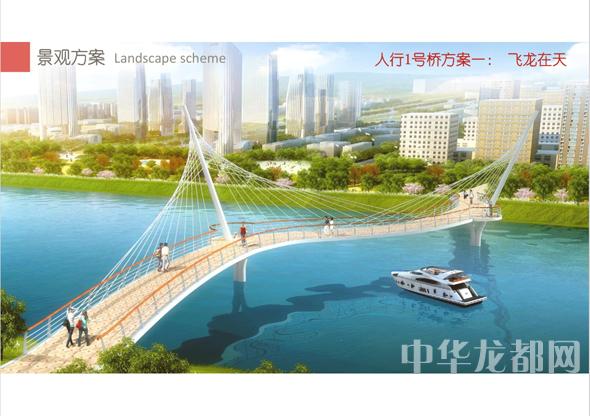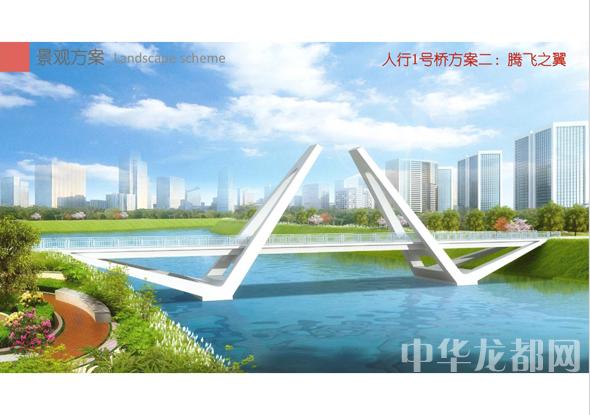 人行1號橋的設(shè)計(jì)方案有兩套,分別為“飛龍?jiān)谔臁焙汀膀v飛之翼”?!帮w龍?jiān)谔臁睘殡p塔斜拉橋。記者從效果圖中看到,該橋呈現(xiàn)出優(yōu)美的線條,宛如一條長龍騰空在天。“騰飛之翼”為V腿連續(xù)鋼箱梁橋。記者從效果圖中看到,橋體簡潔流暢,時(shí)尚現(xiàn)代,橋墩形成穩(wěn)固的三角形,像兩只燕子展翅高飛。
