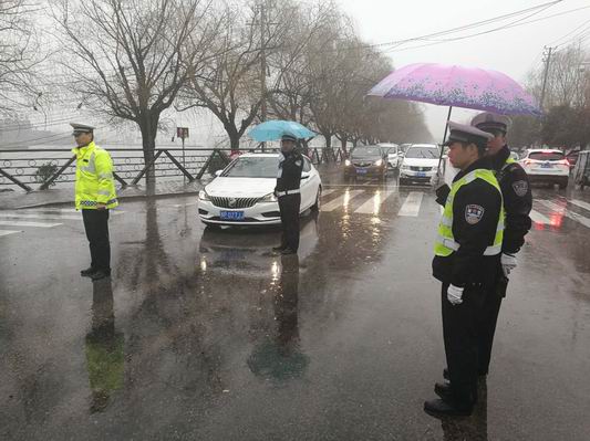 按照會議的統(tǒng)一安排部署,交警大隊城市中隊負(fù)責(zé)羲皇賓館門前、老看守所路口和商城東路的道路保障工作。執(zhí)勤民警合理分配警力,清理引導(dǎo)路面亂停亂放車輛,合理分流駛?cè)胲囕v,規(guī)范指揮路口交通,他們克服寒冷下雨惡劣天氣,充分發(fā)揚不怕苦不怕累的精神。在雨中一刻不停的忙碌著,中隊長閆本志的微信運動的步數(shù)達(dá)到30000多步,成功登頂榜首,交警隊員李炯等帽子淋濕了,衣服淋濕了,鞋子也進(jìn)水了,他們顧不了這些,一絲不茍的工作。他們的辛苦付出感動了過往司機(jī)和行人,一位女士下車送來雨傘,被執(zhí)勤交警婉拒了,后邊的過路行人直接打開車窗為過交警扔下雨傘而去。一會功夫,執(zhí)勤的路口多了各種色彩的花雨傘,在雨中游走,像綻放的太陽花,裝扮了雨中的淮陽。