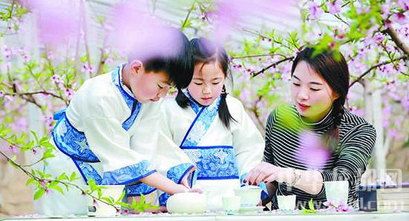 日前,一位年輕的媽媽帶著一雙兒女在扶溝縣韭園鎮(zhèn)的一個溫室大棚基地學習茶藝。據(jù)悉,該基地共有11個桃樹溫室大棚和200畝露地桃林。在近1個月的花期里,該基地免費向游客開放。前來賞花的游客不但可以在花間彈古箏、拍照,也可以學習茶藝,既欣賞了美景,又陶冶了情操。谷志方 李永超 攝
