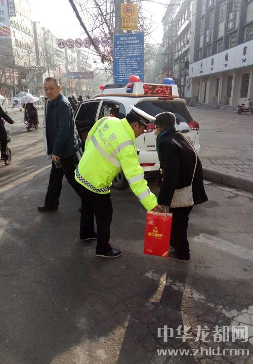 3月10日早上,鄲城縣交警大隊城市一中隊隊長范慶華、指導員徐錕帶隊按照日常工作安排,在新華路與文化路口站崗執(zhí)勤時,看到一位腿腳不便的八旬老人拄著拐杖,手里還提著一箱火腿腸,行動非常緩慢來到路口。