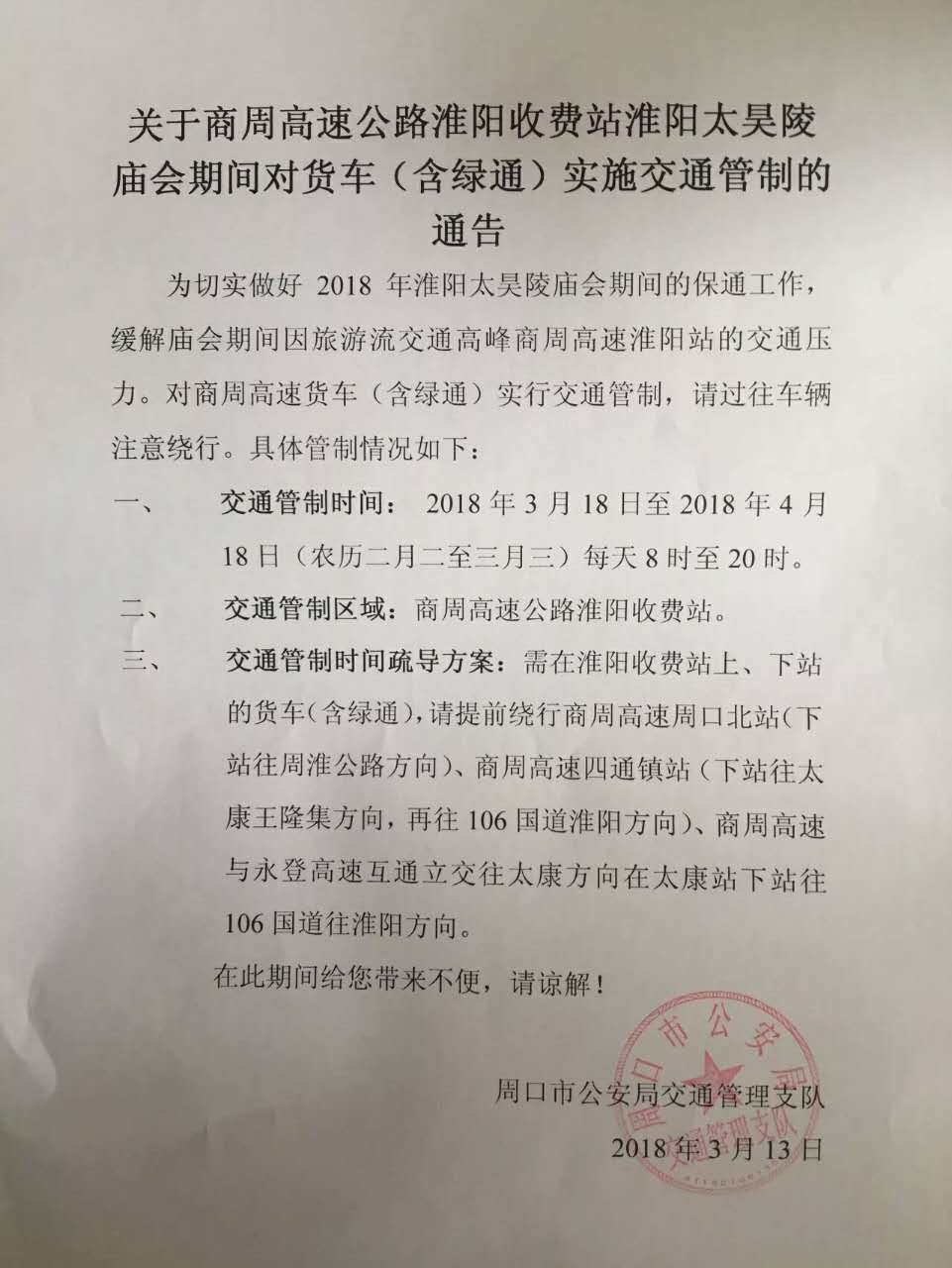 中華龍都網(wǎng)訊(周口報業(yè)全媒體記者 侯俊豫)3月13日,市交警支隊發(fā)布通告稱,為做好2018年太昊陵廟會期間的保通工作,緩解廟會期間商周高速淮陽站的交通壓力。對商周高速貨車(含綠通)實(shí)行交通管制,請過往車輛注意繞行?,F(xiàn)對商周高速貨車(含綠通)實(shí)行交通管制: