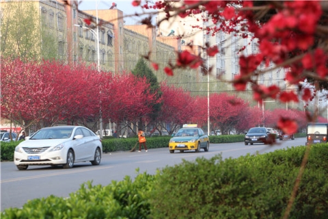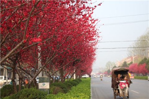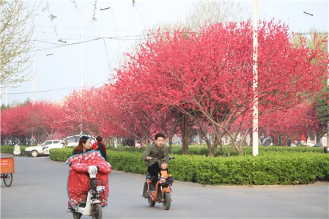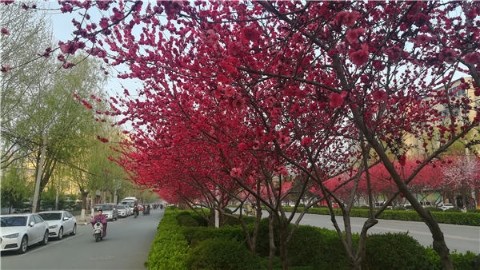 楊樹、垂柳、法桐,這是常見的綠化樹,可是你見過整條道路用桃樹做綠化的嗎?在周口市建設(shè)大道西段,長(zhǎng)達(dá)1公里的主干道兩側(cè)種滿桃樹?,F(xiàn)在正值陽春三月桃花盛開,整條道路成了一片花的海洋,儼然是鬧市區(qū)里的世外桃源。
