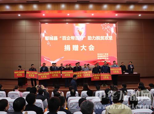 中華龍都網(wǎng)訊(周口報(bào)業(yè)全媒體記者 徐松 文/圖)4月13日,鄲城縣召開“百企幫百村”助力脫貧攻堅(jiān)捐贈(zèng)大會(huì),全縣129家企業(yè)反哺社會(huì)助力脫貧攻堅(jiān),現(xiàn)場捐贈(zèng)近1300萬元。鄲城縣四個(gè)班子領(lǐng)導(dǎo)、部分縣處級領(lǐng)導(dǎo)干部、縣慈善會(huì)會(huì)長、縣扶貧協(xié)會(huì)會(huì)長、縣直各單位和鄉(xiāng)鎮(zhèn)負(fù)責(zé)人等參加捐贈(zèng)大會(huì)??h委書記羅文閣發(fā)表講話,縣長李全林主持會(huì)議。