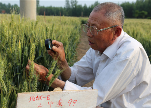 羅友邦老人在實(shí)驗(yàn)田里觀察小麥