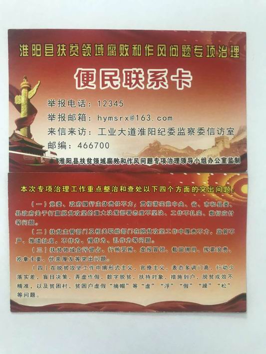 今年4月,淮陽縣扶貧領(lǐng)域腐敗和作風(fēng)問題專項治理全面啟動。為確保專項治理取得實效,縣紀(jì)委監(jiān)委印制發(fā)放“便民聯(lián)系卡”,進一步加大宣傳力度,暢通信訪舉報渠道。他們統(tǒng)一制作的扶貧領(lǐng)域腐敗和作風(fēng)問題專項治理便民聯(lián)系卡,上面印有專項治理工作重點整治和查處的4個方面內(nèi)容。具體包括黨委、政府履行主體責(zé)任不力,脫貧攻堅工作不扎實,敷衍應(yīng)付;扶貧部門及相關(guān)職能部門脫貧攻堅工作中不作為、慢作為、亂作為等;扶貧領(lǐng)域發(fā)生貪污侵占,虛報冒領(lǐng),截留挪用等問題。聯(lián)系卡公布了舉報電話和來信來訪地址,方便群眾對黨員干部和部門的監(jiān)督。
