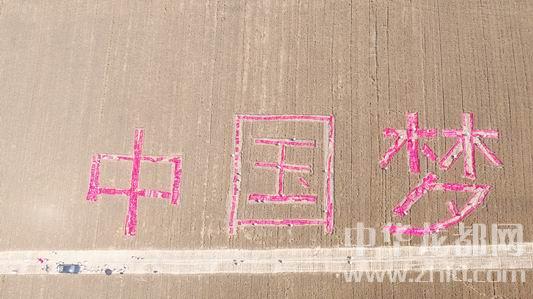 記者在現(xiàn)場(chǎng)看到,“中國(guó)夢(mèng)”三個(gè)字每個(gè)字高約30米,寬約23米,間隔約10米,筆畫寬約2米。為了讓字跡突出,他們把以前懸掛宣傳標(biāo)語(yǔ)的廢棄紅布條,鋪在麥茬上。一片金黃中,紅艷的字體格外奪目。