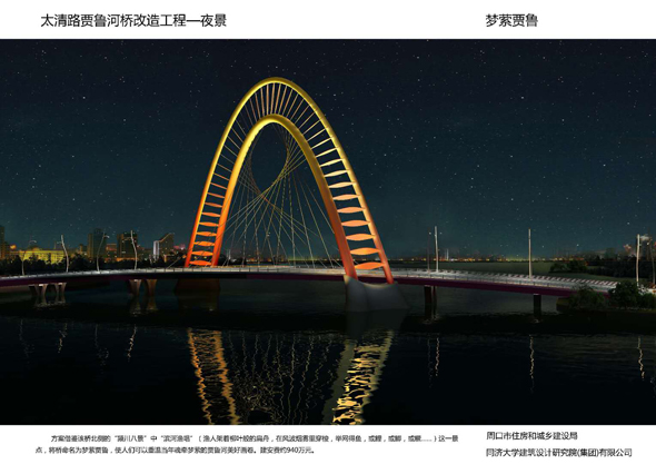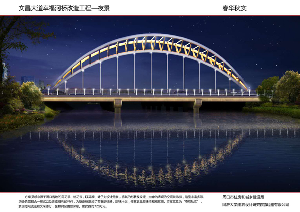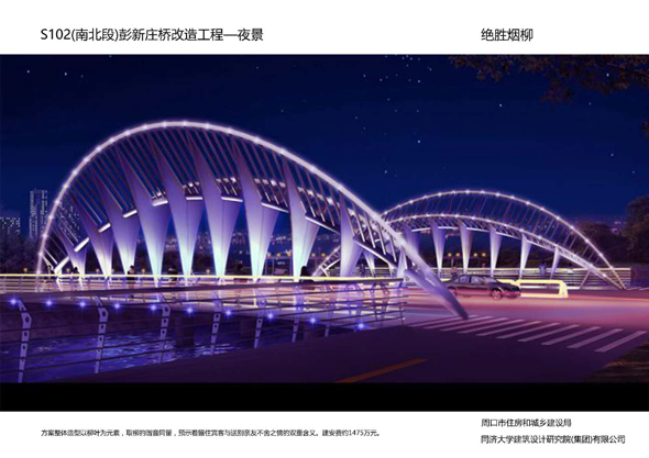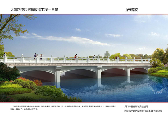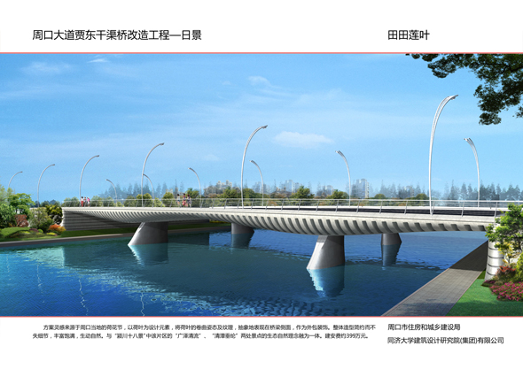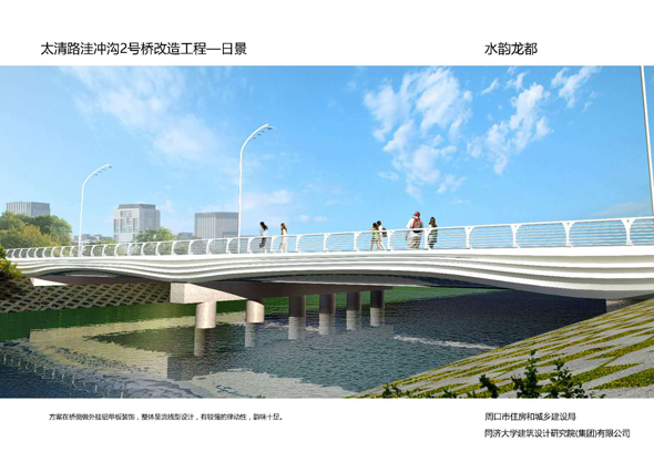 周口大道沙潁河橋景觀改造,設(shè)計(jì)造型簡單柔美,如行云流水,同時(shí)與沙潁河景觀帶相融合,給城市增添了生機(jī)與活力。周口大道賈東干渠橋以荷葉為設(shè)計(jì)元素,造型簡約而不失細(xì)節(jié)。周口大道流沙河橋造型簡潔大氣,線條流暢,像一條青龍游弋在水面上。文昌大道幸福河橋以花瓣、葉子為設(shè)計(jì)元素,造型豐富多彩。文昌大道流沙河故道橋在中分帶位置修建花壇,花壇造型莊重古樸,景石造型端莊沉穩(wěn)。太清路流沙河橋以古建斗拱、窗花為元素,造型儒雅大方。太清路洼沖溝2號(hào)橋以“輻轂相依”為名,既融合環(huán)境,又有團(tuán)結(jié)、合作的寓意。太清路賈魯河橋,增加了景觀造型,使人們可以重溫當(dāng)年賈魯河的美好畫卷。彭新莊橋以柳葉為元素,預(yù)示著留住賓客與送別親友的不舍之情的雙重含義。