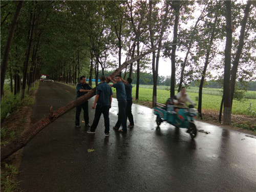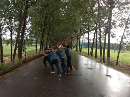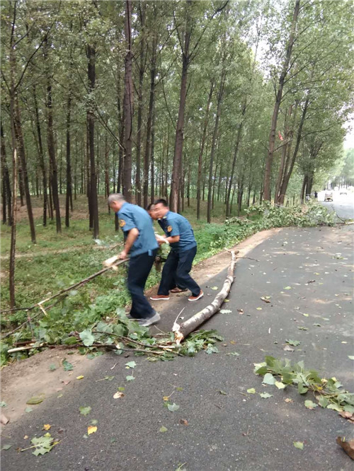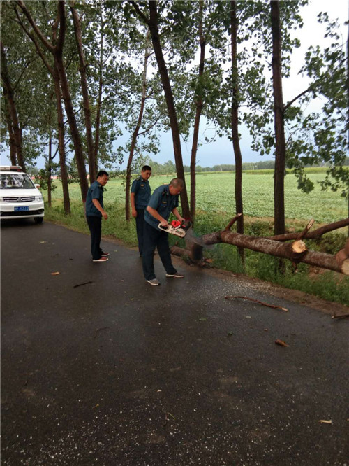 在東夏看張立交橋、李莊橋處,多棵行道樹被大風刮倒,大量枝掉落在公路上,嚴重危及行車安全和道路通行,執(zhí)法人員立即冒雨采取安全防護措施,并利用車載應(yīng)急搶險工具將倒塌在公路上直徑為10-20cm的樹木進行及時清理,并對殘枝落葉進行了全面清掃。歷時三個小時,及時地消除了道路安全隱患,保障人民群眾的出行安全。