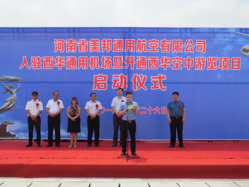 8月26日,河南省美邦通用航空有限公司入駐西華通用機(jī)場暨開通西華空中游覽項(xiàng)目啟動儀式在西華縣南廣場舉行,西華縣委常委、常務(wù)副縣長王獻(xiàn)超,西華縣人大常委會副主任龐友敬,西華經(jīng)開區(qū)管委會主任宋廣良,西華經(jīng)濟(jì)技術(shù)開發(fā)區(qū)城市投資有限公司總經(jīng)理朱洪江;美邦控股集團(tuán)總經(jīng)理、河南省美邦通用航空有限公司董事長王洪濤等出席啟動儀式。