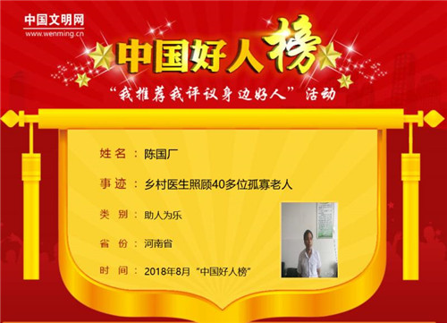 太康縣鄉(xiāng)村醫(yī)生陳國廠投資600萬元建醫(yī)養(yǎng)院捐給國家,義務照顧40多位孤寡老人義舉引起社會各界廣泛關注。8月31日,中國文明網(wǎng)公布消息:陳國廠光榮入選8月份“助人為樂”類“中國好人榜”。截至目前,該縣入選“中國好人榜”已達40名。