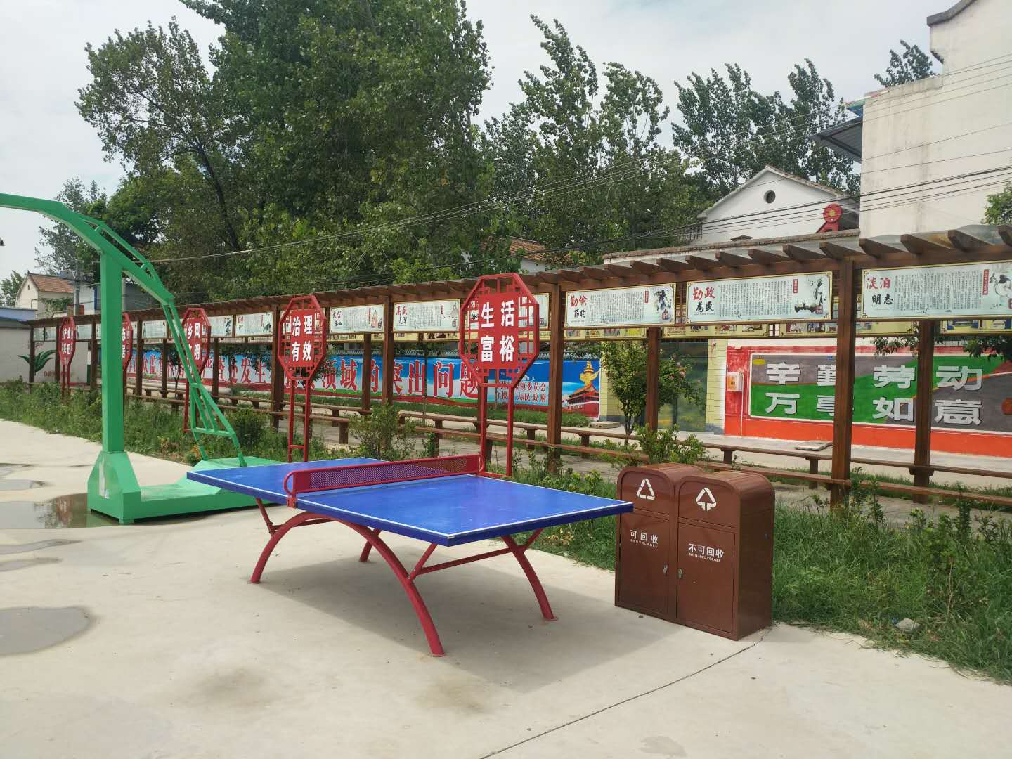 在近2000平方米的文化廣場上,南側(cè)聳立著高高的旗桿,上方五星紅旗迎風(fēng)飄揚(yáng);北側(cè)一字排開牽引器、漫步機(jī)、 健騎機(jī)、扭腰器等健身器材,五六位鶴發(fā)童顏的老年人正樂呵呵地鍛煉;東側(cè)設(shè)立的籃球架、乒乓球臺正等待放學(xué)的孩子前來玩耍;西側(cè)新設(shè)的木排廊成了村民休閑聊天的好去處。村黨支部書記郝道杰稱,前一段,有村民提出,健身后累了缺少休息的地方。在征求群眾意見的基礎(chǔ)上,他們設(shè)置了這個木質(zhì)排廊。