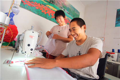 生意閑的時(shí)候,朱建舟又和妻子商量,借錢購(gòu)買了兩臺(tái)縫紉機(jī),幫助附近一家工廠加工環(huán)保袋。加工活雖然不累,但對(duì)于雙腿殘疾的朱建舟來說卻很困難。一向愛動(dòng)腦筋的朱建舟自己動(dòng)手把縫紉機(jī)踏板改裝成手動(dòng)式的,大大提高了工作效率。“一個(gè)月能掙2000多元錢,還能顧家,照顧病人和孩子?!蓖跷迥菪睦镉姓f不出的高興。
