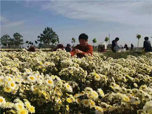 當(dāng)日,位于高集鄉(xiāng)北部的黨橋、雙堂等幾個(gè)行政村,也是熱鬧非凡。一臺(tái)臺(tái)大小不同的車輛,滿載著剛從地里摘下的鮮菊花,正往富甲一方菊花加工廠里銷售,縷縷的菊花清香隨風(fēng)飄來(lái),煞是誘人。在富甲一方合作社帶動(dòng)下,今年有16戶貧困戶種植80多畝菊花,鄉(xiāng)政府對(duì)首次種植的貧困戶負(fù)責(zé)技術(shù)培訓(xùn),并給予每畝1000元的生產(chǎn)獎(jiǎng)補(bǔ)。今年菊花每公斤4元左右,麥茬種植菊花每畝可產(chǎn)鮮菊1100-1300公斤,去掉雇人摘菊花費(fèi)用每公斤0.3元,每畝可收入4000-5000元。種植菊花的貧困戶孫建國(guó)在富甲一方收購(gòu)現(xiàn)場(chǎng),正樂呵呵的數(shù)著賣菊花得來(lái)的大把鈔票。