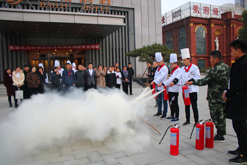 在培訓(xùn)現(xiàn)場,為更好地將學(xué)到的知識(shí)與實(shí)踐相結(jié)合,大隊(duì)宣傳人員組織參訓(xùn)人員開展了實(shí)地滅火消防演練,酒店全體員工分批次輪番上陣,通過使用滅火器及時(shí)迅速地?fù)錅缁馂?zāi)操練,提高參訓(xùn)人員正確規(guī)范使用滅火器材的能力,達(dá)到了良好效果。