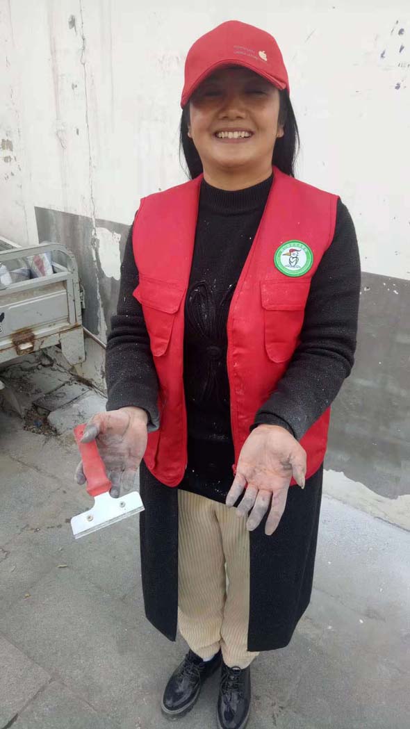 周口市啄木鳥志愿者服務(wù)工作委員會臨時(shí)黨支部書記、周口市慈孝文化促進(jìn)會會長孫彩云更是不怕臟,不怕累,連個(gè)手套都不帶,直接用雙手拿著鏟刀或者抹布清理墻上的小廣告,最后弄得雙手和滿身都是污漬?!盀榱宋覀兊某鞘懈粒鳛橐幻驹刚?,就應(yīng)該不怕累,不怕苦。”