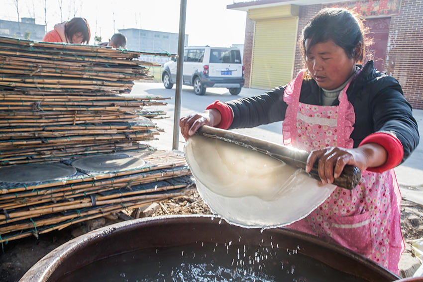 該村地處豫皖兩省交界處,是一個(gè)聞名遐邇的粉皮加工專業(yè)村。村里人手工做粉皮已有近百年歷史,從事粉皮加工的村民達(dá)500多人。 來(lái)到這里,您可以看到手工做粉皮的全過(guò)程。(王天定文/圖)