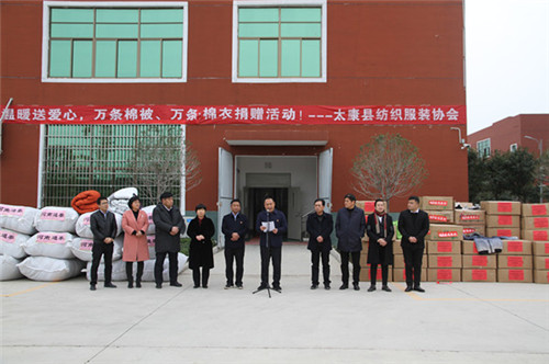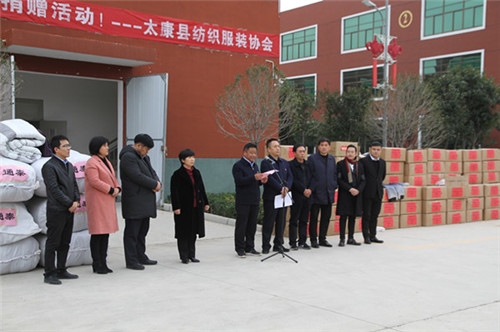 太康縣委副書(shū)記、政法委書(shū)記王程清在致辭中指出,扶貧濟(jì)困、樂(lè)善好施是中華民族的傳統(tǒng)美德,通泰紡織、銀鑫棉業(yè)、萬(wàn)利源棉業(yè)等縣紡織協(xié)會(huì)成員單位通過(guò)捐款捐物、產(chǎn)業(yè)幫扶、就業(yè)幫扶、基礎(chǔ)設(shè)施幫扶等多種形式投入到脫貧攻堅(jiān)行動(dòng)中,幫助貧困群眾發(fā)展生產(chǎn)、改善生活條件、擺脫疾病困擾、完成學(xué)業(yè)夢(mèng)想、為貧困群眾早日脫貧貢獻(xiàn)出自己的一份力量,并為他們捐贈(zèng)棉衣棉被的善舉表示感謝。