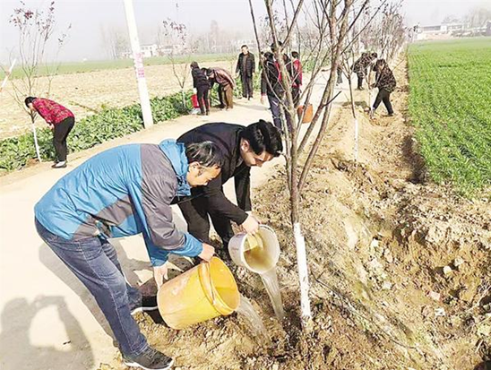 縣規(guī)劃辦李華兵帶領(lǐng)幫扶隊(duì)員在鄧城鎮(zhèn)路口村和村民共同種下致富之樹。 (莊正富 攝)