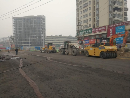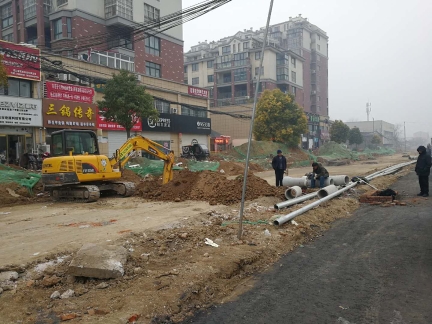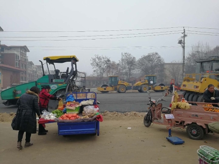 記者今日走訪漢陽路中段(穎河路-建設(shè)路)看到,目前該路段機動車道已鋪上黑色的混凝土物質(zhì),人行道則是壓實過的土路。壓路機等設(shè)備??吭诘缆穬深^,并未啟動,有兩臺挖掘機及數(shù)十名工人在人行道上,鋪設(shè)下水道。施工路段內(nèi),有不少菜販在沿街叫賣。