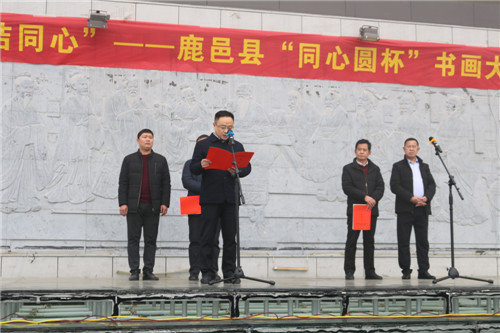 為慶祝改革開放40周年,深入學(xué)習(xí)習(xí)近平新時代中國特色社會主義思想和黨的十九大精神, 鞏固和發(fā)展愛國統(tǒng)一戰(zhàn)線,在新時代畫好最大同心圓, 團結(jié)和帶領(lǐng)各族各界人士深入挖掘中華優(yōu)秀傳統(tǒng)文化蘊含的思想觀念、人文精神、道德規(guī)范,讓中華文化展現(xiàn)出永久的魅力和時代風(fēng)采, 12月20日上午,由中共鹿邑縣委統(tǒng)戰(zhàn)部主辦、縣文學(xué)藝術(shù)界聯(lián)合會承辦、“天地人筆業(yè)”協(xié)辦的鹿邑縣“紀(jì)念改革開放四十周年·同心圓杯書畫大賽” 在城區(qū)問道苑廣場開展??h委常委、統(tǒng)戰(zhàn)部部長閆家明出席開幕式并講話??h委統(tǒng)戰(zhàn)部常務(wù)副部長李繼良,縣文聯(lián)主席王亞飛,副主席于連河以及本次全體獲獎和入展作者,文聯(lián)所屬各協(xié)會主席團成員近200人參加開幕式。