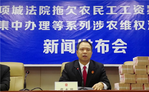 新聞發(fā)布會現(xiàn)場,首先就項城法院涉農(nóng)維權活動的進展及取得的階段性成果等方面,向與會人員進行了通報和說明。據(jù)統(tǒng)計,經(jīng)過全院執(zhí)行干警共同奮戰(zhàn),截至目前,全院共受理涉農(nóng)案件73件,審結69件,標的310多萬元;執(zhí)結35件,標的200多萬元。