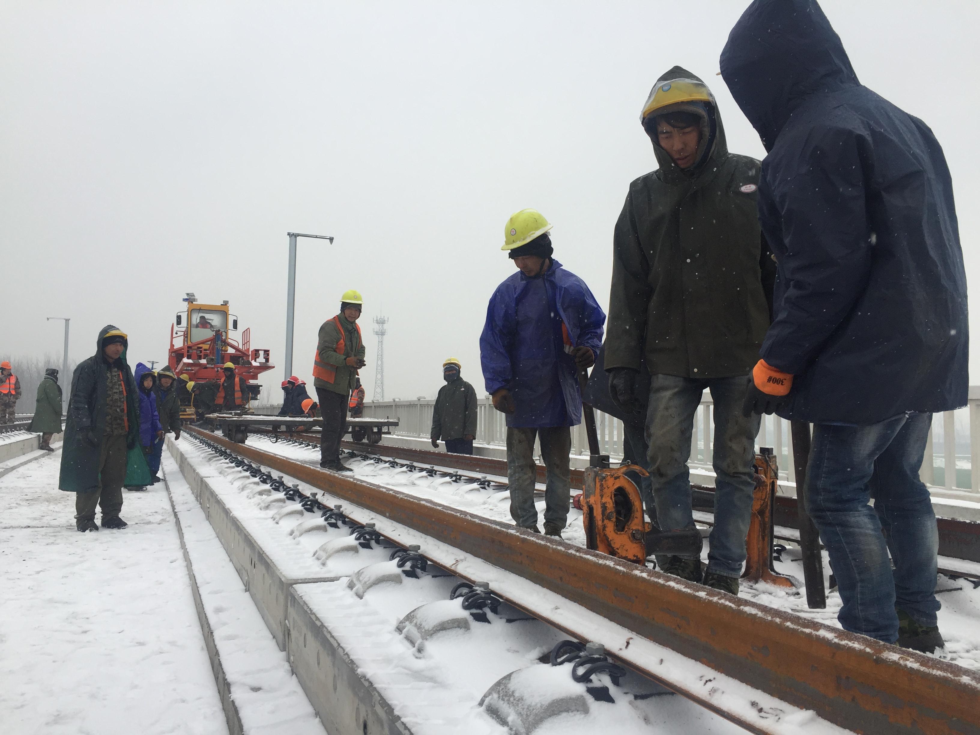 1月9日,漫天飛雪,寒氣逼人,鄭阜高鐵西華段建設(shè)現(xiàn)場(chǎng)卻熱火朝天。為確保工程建設(shè)如期推進(jìn),中鐵一局的工人們冒雪以每天至少5公里的速度進(jìn)行鋪軌作業(yè)。據(jù)了解,鄭阜高鐵西華段全長(zhǎng)33公里,鋪軌工作預(yù)計(jì)5日內(nèi)完工。 記者 張猛 攝