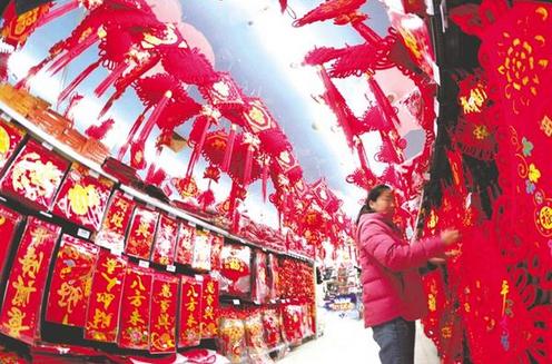 記者近日采訪看到,周口的年貨市場已經(jīng)開啟,年畫市場最先吹起紅火的節(jié)日風,紅彤彤的對聯(lián)、中國結(jié)等被商家掛滿店鋪,吸引客人上門。記者 梁照曾 攝