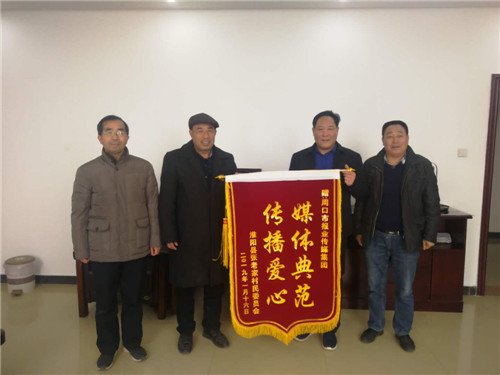 “傳播愛(ài)心,媒體典范”“為民解憂愁,心系千萬(wàn)家”。1月25日上午,淮陽(yáng)縣劉振屯鄉(xiāng)張老家行政村村支書(shū)張紀(jì)全專程趕到周口,給周口報(bào)業(yè)傳媒集團(tuán)、周口市啄木鳥(niǎo)志愿者服務(wù)工作委員會(huì)送來(lái)兩面錦旗,表達(dá)他們的感激之情(如圖)。