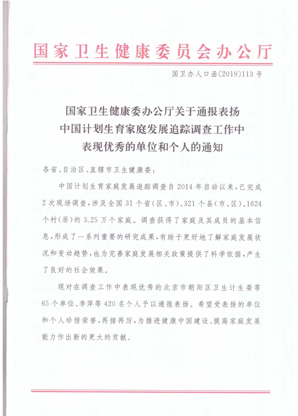 通知顯示,中國計(jì)劃生育家庭發(fā)展追蹤調(diào)查自2014年啟動(dòng)以來,已完成2次現(xiàn)場調(diào)查,涉及全國31個(gè)?。▍^(qū)、市)、321個(gè)縣(市、區(qū))、1624個(gè)村(居)的3.25萬個(gè)家庭。調(diào)查獲得了家庭及其成員的基本信息,形成了一系列重要的研究成果,有助于更好地了解家庭發(fā)展?fàn)顩r和變動(dòng)趨勢,也為完善家庭發(fā)展相關(guān)政策提供了科學(xué)依據(jù),產(chǎn)生了良好的社會(huì)效果。國家衛(wèi)健委對在此項(xiàng)工作中表現(xiàn)優(yōu)秀的65個(gè)單位、420名個(gè)人進(jìn)行通報(bào)表揚(yáng),希望受表揚(yáng)的單位和個(gè)人珍惜榮譽(yù),再接再厲,為推進(jìn)健康中國建設(shè)、提高家庭發(fā)展能力作出新的更大的貢獻(xiàn)。