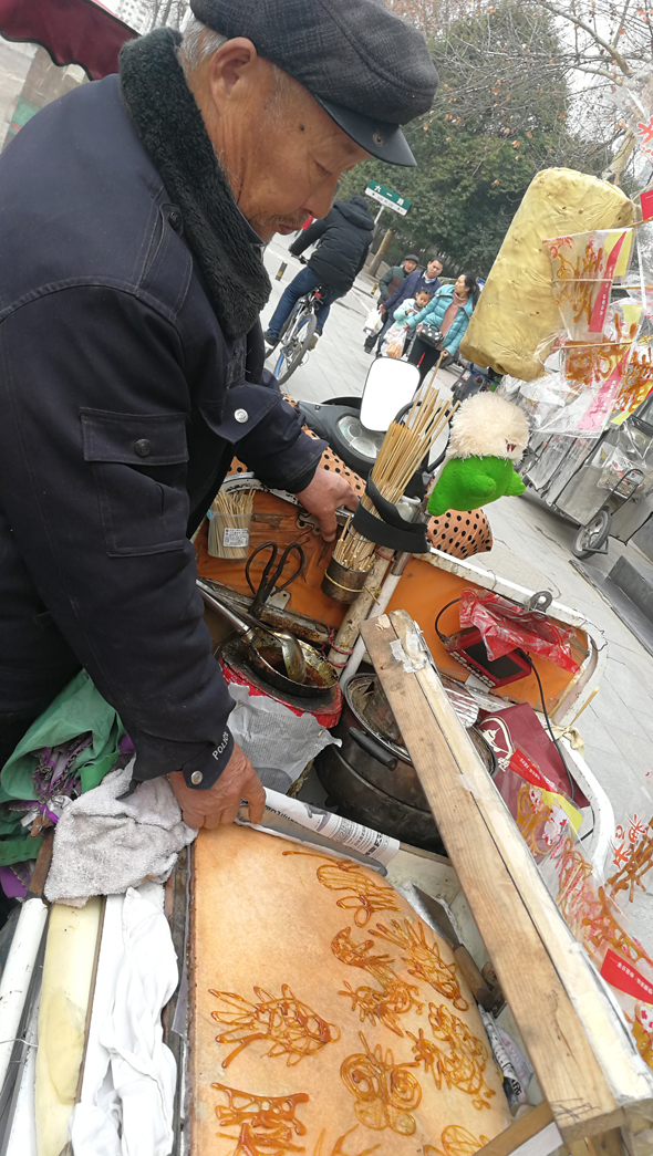以糖稀為原料制作一幅糖畫,只需要1分多鐘。昨日,記者在中心城區(qū)七一路與六一路交叉口附近,目睹了閆先生制作糖畫的過程。閆先生以糖稀為原料制作的小動物惟妙惟肖,還有“?!薄皭邸钡茸?。閆先生告訴記者,他是周口本地人,制作糖畫已30多年。記者 關秋麗 攝