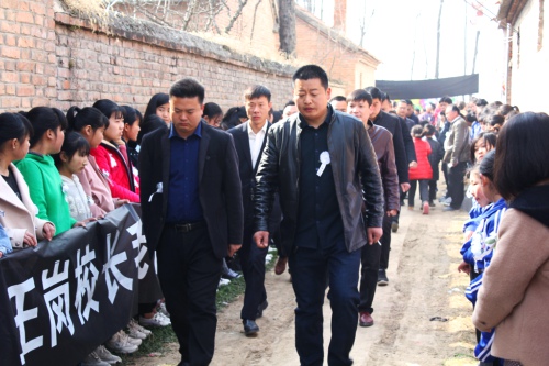 院內(nèi)正廳上方,懸掛著黑底白字的橫幅“沉痛悼念王崗同志”,院外道路兩側(cè),擺滿了人們敬獻的黑紗、花圈。市教體局領導來了,縣政府副縣長肖煒來了,縣教體局局長劉現(xiàn)營來了;局黨組成員、各鄉(xiāng)校校長來了,王崗最愛的學生、同事來了;學生家長也來了……大家胸佩白花,向這位愛崗敬業(yè)的基層校長表示崇高的敬意和深切的哀悼。