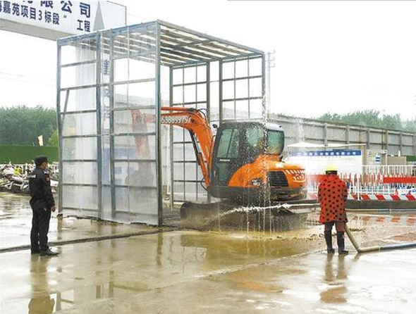 4月27日上午,川匯區(qū)一工地大門口,準(zhǔn)備駛出工地的工程車正接受清洗。工作人員說(shuō),每輛工程車都有規(guī)定的清洗時(shí)間,一般是兩分多鐘,保證從工地出去的車輛干干凈凈。記者 王凱 攝