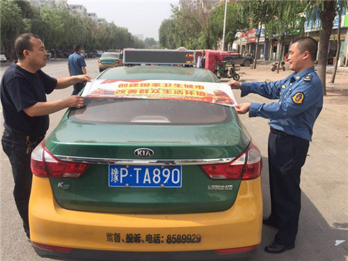 由區(qū)五城聯(lián)創(chuàng)指揮部牽頭,組織區(qū)城管局、區(qū)交通運(yùn)輸局等職能部門,利用城管執(zhí)法車輛、環(huán)衛(wèi)保潔車輛、交通執(zhí)法車等,統(tǒng)一張貼宣傳標(biāo)語進(jìn)行宣傳。日出動(dòng)各類宣傳車輛109輛。區(qū)五城聯(lián)創(chuàng)指揮部辦公室會(huì)同區(qū)交通運(yùn)輸局在中心城區(qū)出租車上統(tǒng)一張貼創(chuàng)衛(wèi)宣傳標(biāo)語和禁煙標(biāo)志,累計(jì)張貼出租車600余輛。多種載體宣傳。利用車體標(biāo)語、車載音響、大喇叭、出租車頂燈等載體,大密度宣傳創(chuàng)衛(wèi)標(biāo)語口號,播放統(tǒng)一灌制的創(chuàng)衛(wèi)宣傳音頻。