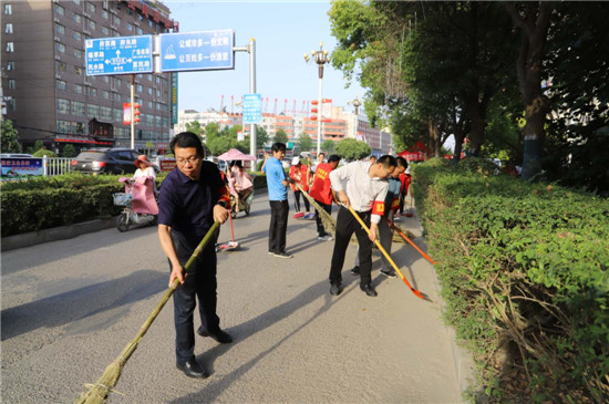 6月4日,烈日炙烤著大地,氣溫升至37攝氏度,路面溫度更高。鄲城縣財政局長張振新帶領(lǐng)“創(chuàng)衛(wèi)”值班人員,正在新華路西段責(zé)任區(qū)內(nèi)清掃路面、撿拾落葉、噴灑花木、落實(shí)“門前五包”……大家忙得汗流浹背,始終無一人脫崗。