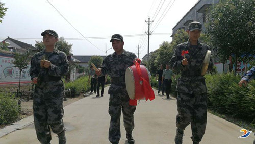 儀式結(jié)束后,丁有亮一行跟隨者武裝部工作人員,敲著鑼打著鼓走向軍屬代表家庭現(xiàn)場為他們懸掛軍屬光榮牌。