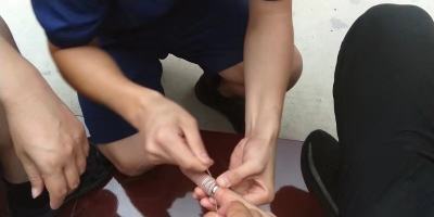 經(jīng)過(guò)查看,由于尺寸不合適,該男子左手中指已經(jīng)被戒指卡的出現(xiàn)充血,手指腫脹嚴(yán)重。考慮到用剪切器等器械剪戒指可能會(huì)傷到手指,指戰(zhàn)員利用纏線解線的方法,用細(xì)線穿過(guò)戒指在手指上纏繞,然后慢慢拉線,利用細(xì)線的滑潤(rùn)效果幫助取下戒指,很快戒指被成功取下。