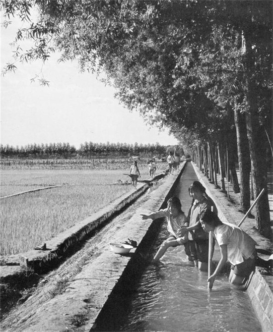 1975年6月,商水到周口公路兩邊的農(nóng)業(yè)水利干渠。 上世紀70年代,大批上海知識青年來到周口、商水、淮陽,進行“上山下鄉(xiāng)”鍛煉,他們曾在商水利用干渠灌溉特點試驗種植水稻。現(xiàn)在,淮陽縣檔案館還存有一批知青報到的花名冊。 (圖片來源:圖書《Former yellow river flood area transformed》中文名《黃泛區(qū)變化》)